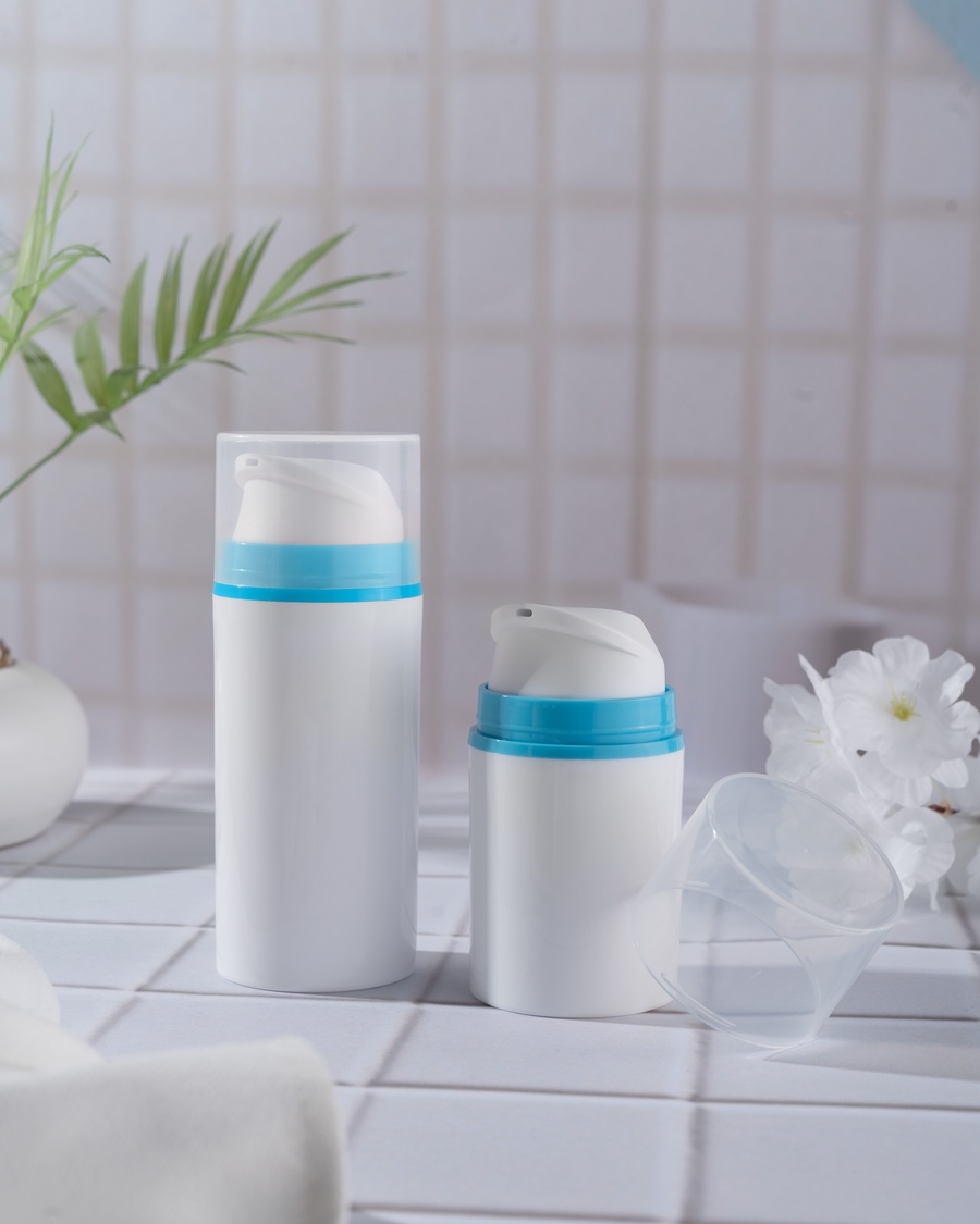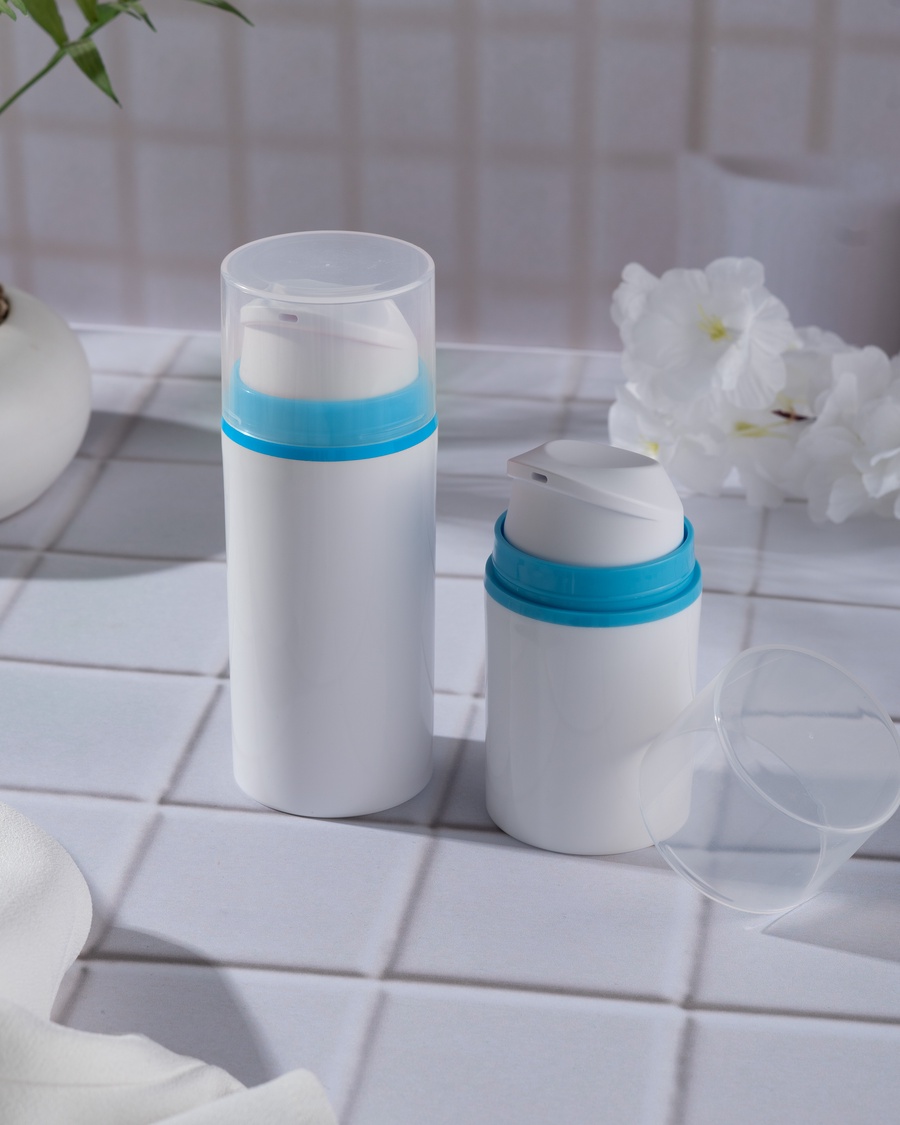 White with Blue ring airless cream bottle offering clean, hygienic, high-quality packaging that protects formulas and enhances skincare brand presentation
