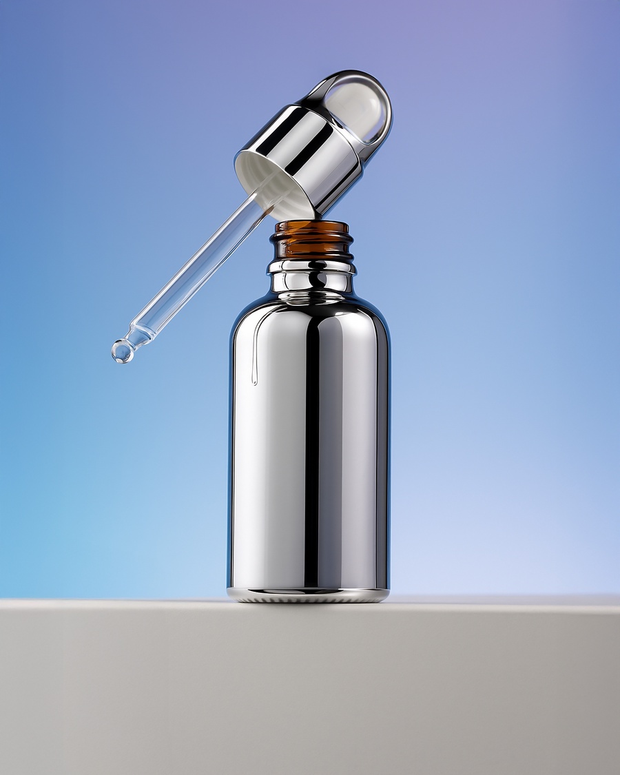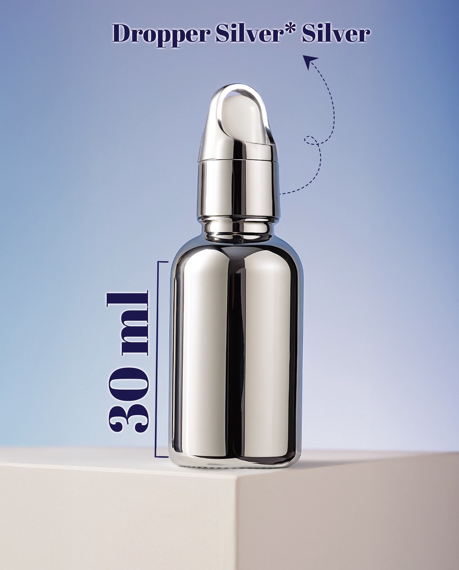 A premium silver-on-silver dropper bottle offering a sleek, elegant look with precise dispensing for advanced skincare and beauty formulas